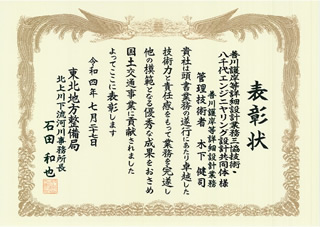 この度、東北地方整備局北上川下流河川事務所所より優良業務施工者として事務所長表彰を受賞致しました。